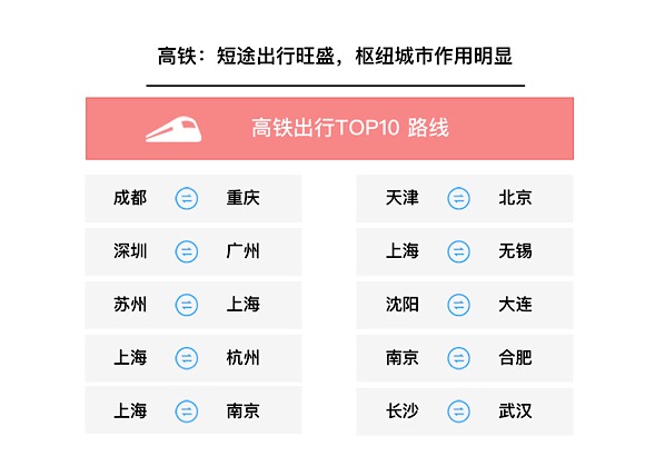 其中,高铁有效缩短了人们出行的时间,将更多原本计划在本地休息的需求变为去到高铁3小时左右的范围旅行。据报告预测,国庆期间,高铁出行TOP往返路线以短途为主,枢纽城市作用明显,比如上海与苏州之间、成都与重庆之间、深圳与广州之间等需求最为旺盛。