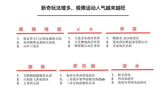 在游玩项目方面,玻璃栈道、VR、冲浪、潜水、蹦极、摩托艇等新奇玩法人气越来越旺。可以说,旅游市场正从观光旅游走向观光、休闲度假、个性体验等并重的格局。