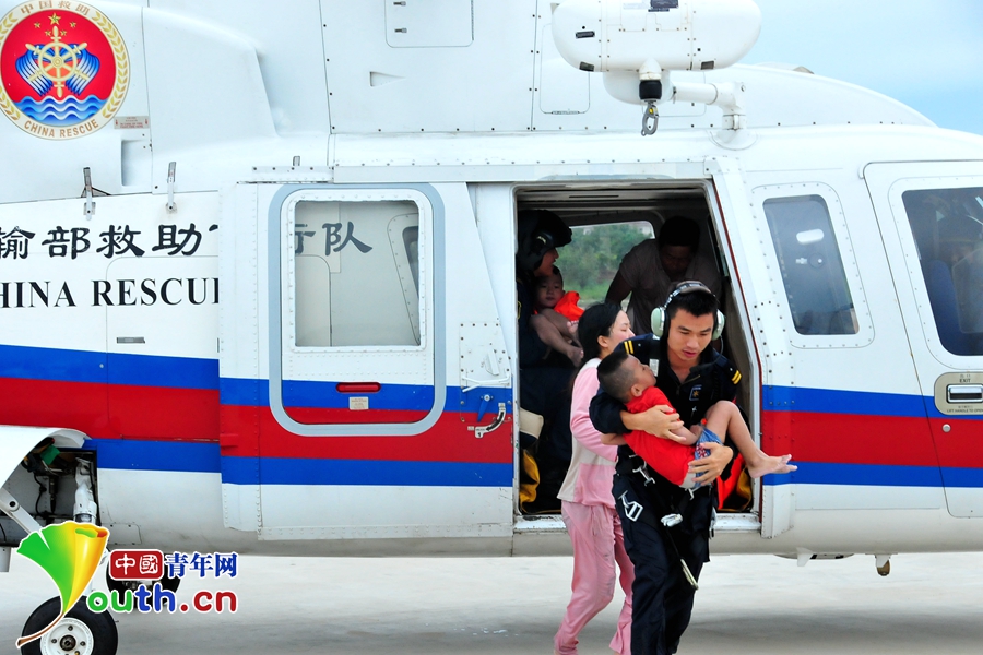 蒋小华抱着落水小孩安全离开救助直升机。飞行队供图