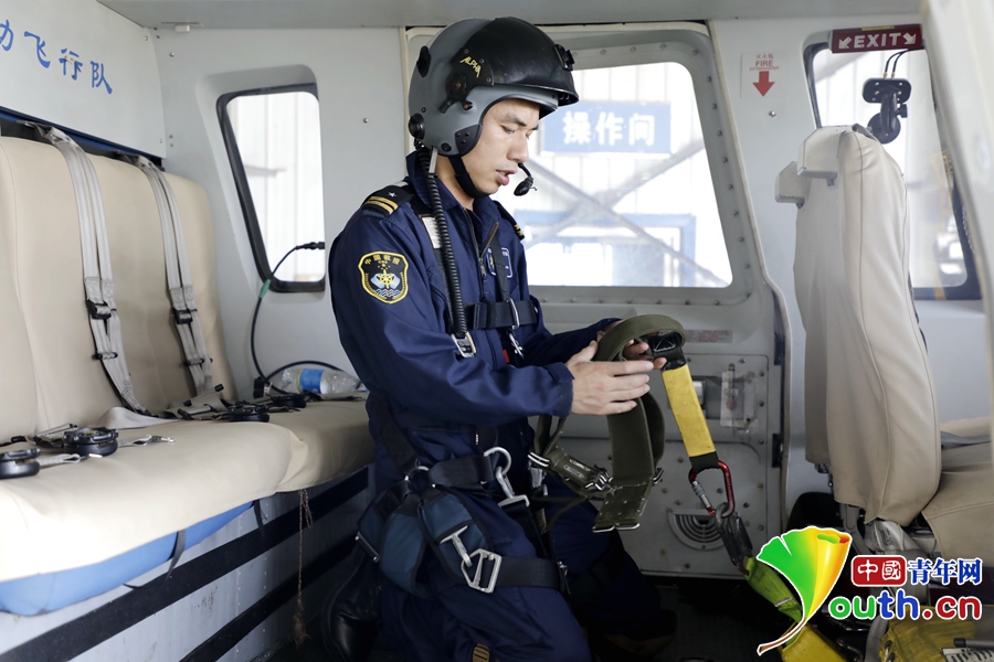 蒋小华在救助直升机上。中国青年网见习记者李慧慧 摄