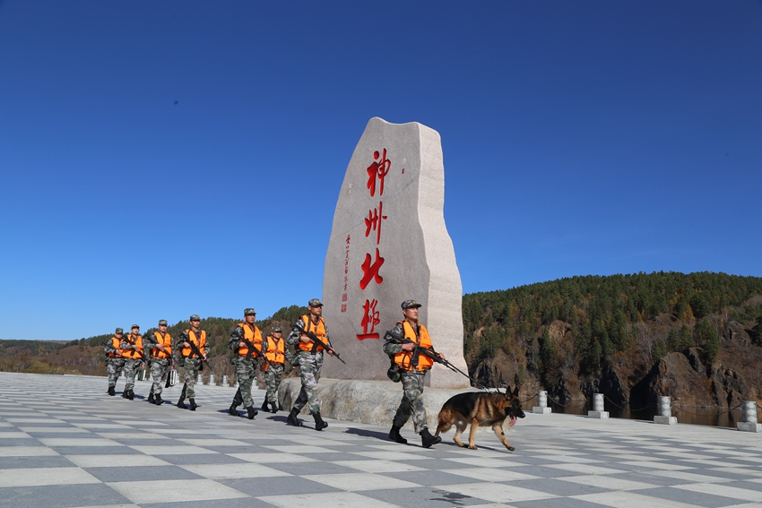 连队官兵在江边巡逻,途径漠河北极村标志性石碑“神州北极”。 摄影 李文学