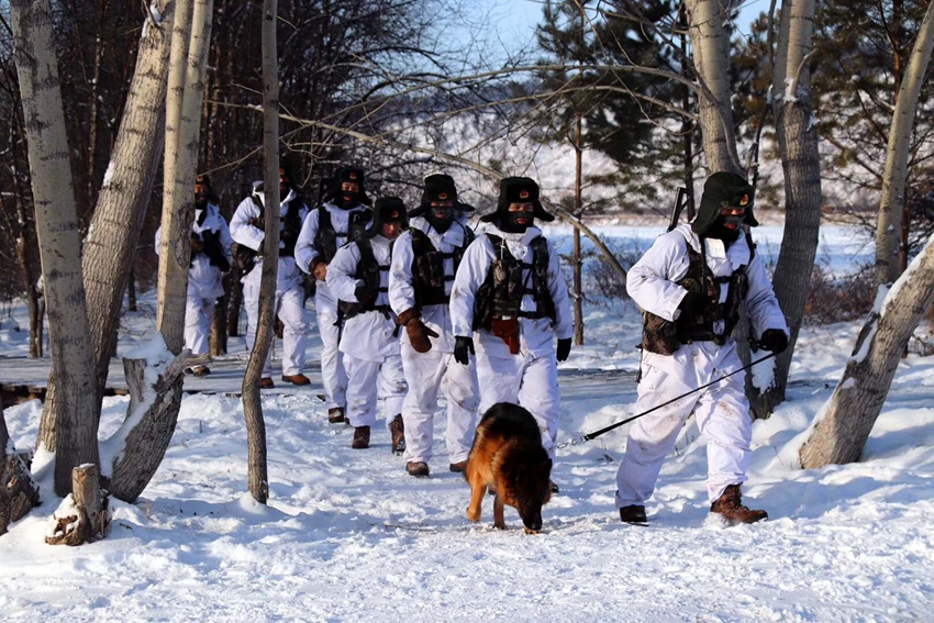 连队官兵在林中巡逻,身上衣物重达10斤。 “北极哨所”供图