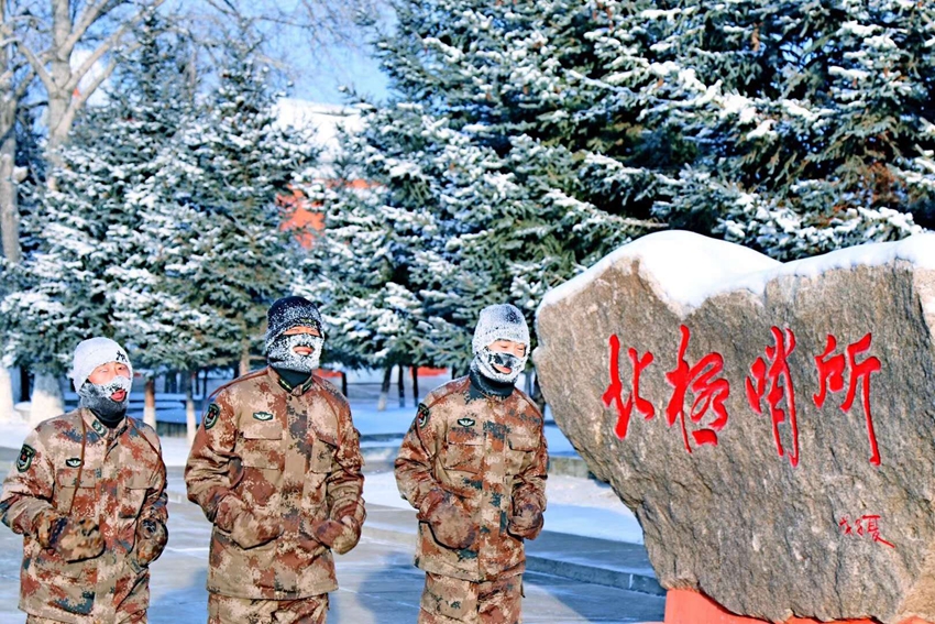 连队官兵展示结冰的睫毛,在漠河北极村,冬季最冷可达-52.3℃。“北极哨所”供图