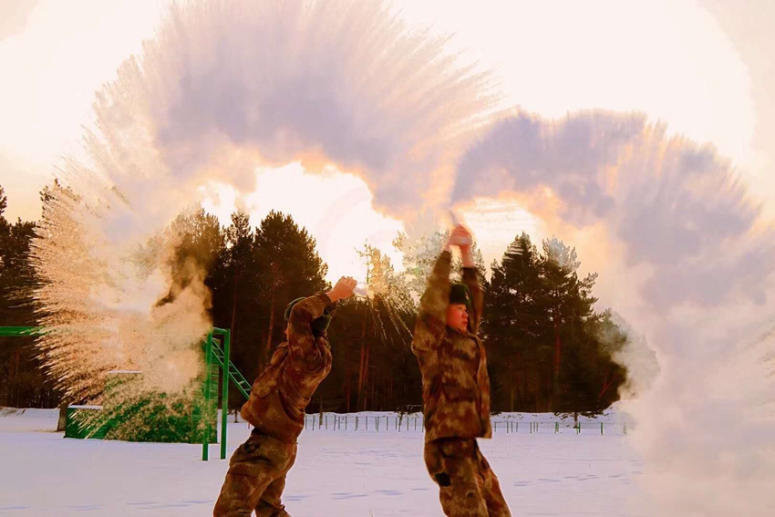 “泼水成冰”是官兵们冬日必有的户外活动 “北极哨所”供图