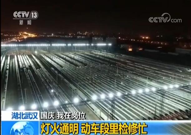 武汉动车段是全国规模较大的高速列车检修基地之一,重点承担中南地区的动车组检修任务。国庆期间,每天晚上,有将近100趟动车组回到这里进行检修养护,整齐排列的高铁动车,万箭待发,就如同“陆地航母”一样,非常壮观。