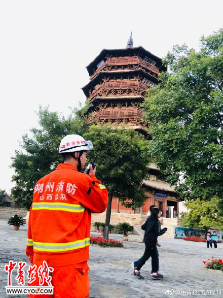 在拥有近千年历史的应县木塔前,20岁的消防员小刘紧张地忙碌着。“这种纯木结构的古建筑必须严防各种烟火。”“十一”期间客流量猛增,小刘依然精神抖擞,“消防员确实责任重大。不过每次看到中外游客发出惊叹,还是能迅速回血。”许亚杰/摄