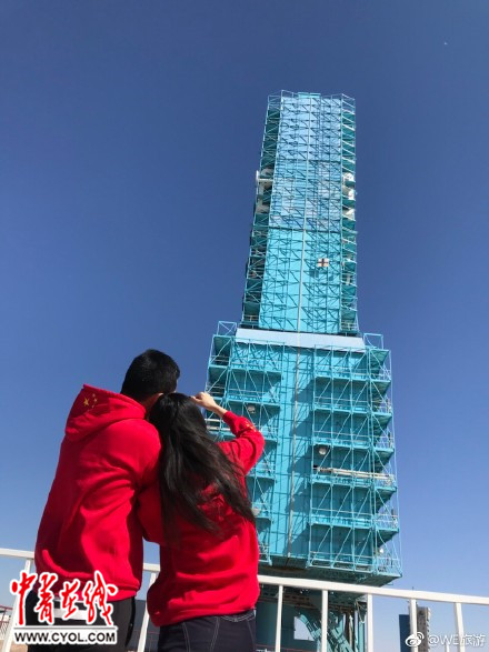 10月3日上午,一对恋人在酒泉卫星发射中心的发射塔前拍照留念。@WE旅游/摄