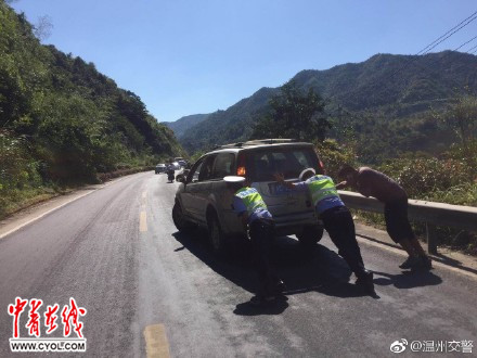 汽车在路上抛锚,民警立即帮忙将车辆推至安全区域。假日期间,交警蜀黍助您安全行!@温州交警 供图