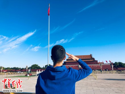 一个正在向国旗敬礼的孩子。孟光辉/摄
