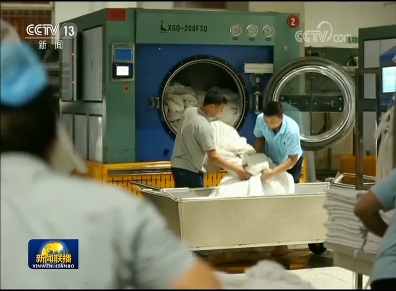 晚上11点,哈尔滨铁路客运段洗涤车间一片忙碌,张艳霞和同事们连夜在清洗火车床单、枕套。国庆节期间,旅客猛增,他们的工作量也比平时增加了一倍,一晚上分拣、洗涤、烘干消毒,走个不停。