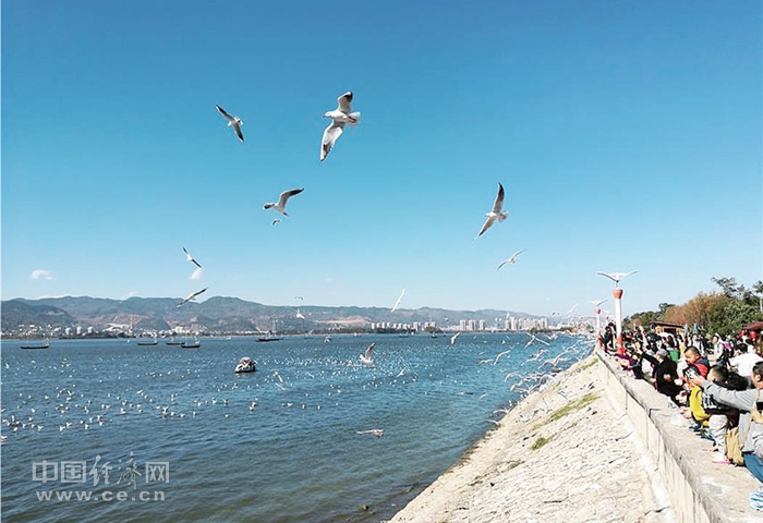 近年来,云南昆明市通过建设森林城市,城市生态环境显著改善。图为红嘴鸥在洱海与市民嬉戏。经济日报-中国经济网记者 黄俊毅摄