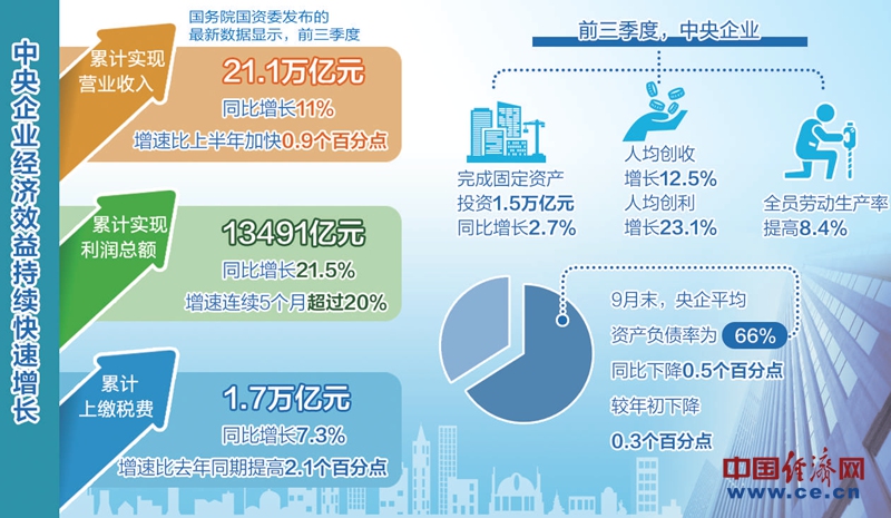 “三增”为央企营业收入增、效益增、税费贡献增。前三季度,央企累计实现营业收入21.1万亿元,同比增长11%,增速比上半年加快0.9个百分点,收入增速已连续4个月超过10%;累计实现利润总额13491亿元,同比增长21.5%,增速连续5个月超过20%;累计上缴税费1.7万亿元,同比增长7.3%,增速比去年同期提高2.1个百分点。“一降”为负债率下降,9月末,央企平均资产负债率为66%,同比下降0.5个百分点,较年初下降0.3个百分点。