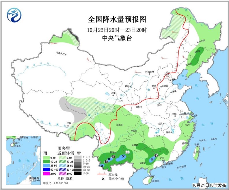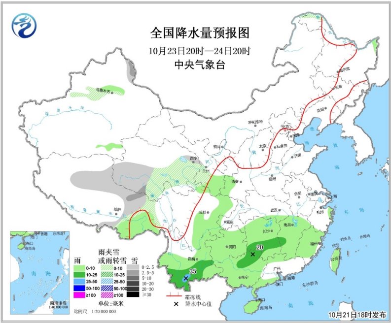 10月23日20时至24日20时,北疆东部和新疆沿天山地区、青藏高原中东部等地部分地区有小到中雪或雨夹雪。西藏东南部、甘肃南部、江南大部、西南地区东部和南部、华南大部和台湾岛等地部分地区有小到中雨,其中,云南西南部等地部分地区有大雨。