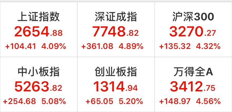 今天A股的行情大家都看到了,受到周末各种利好的影响,今日三大股指集体大幅高开,沪指强势收复2600点,创业板指重回1300点,创指最大涨幅达6%,两市超200只个股涨停,全天成交额超4100亿元,上一交易日约为2870亿元。而整体市值上,A股一日飙涨1.9万亿元。