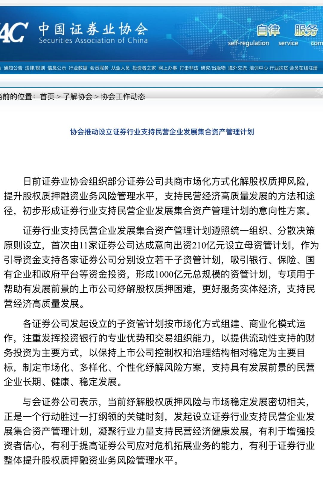 证券业协会组织部分证券公司共商市场化方式化解股权质押风险,提升股权质押融资业务风险管理水平,初步形成证券行业支持民营企业发展集合资产管理计划的意向性方案。