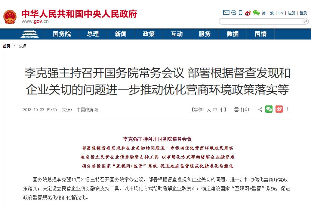 李克强10月22日主持召开国务院常务会议。布署根据督查发现和企业关切的问题,进一步推动优化营商环境政策落实;决定设立民营企业债券融资支持工具,以市场化方式帮助缓解企业融资难。