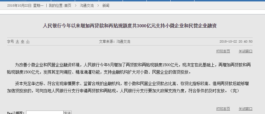 央行官网周一晚发文称,为改善小微企业和民营企业融资环境,人民银行今年6月增加了再贷款和再贴现额度1500亿元,现决定在此基础上,再增加再贷款和再贴现额度1500亿元,发挥其定向调控、精准滴灌功能,支持金融机构扩大对小微、民营企业的信贷投放。