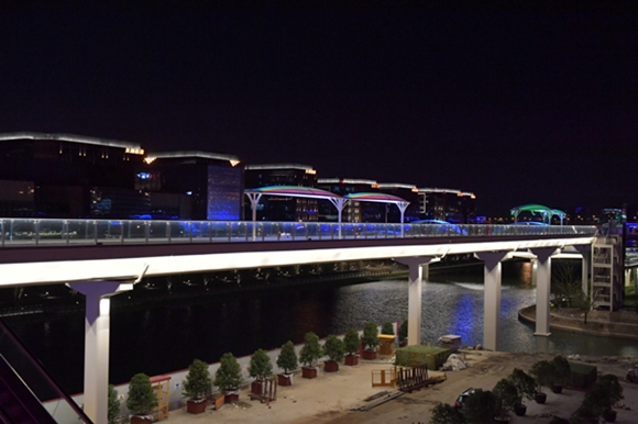 步行:九月底,连接虹桥商务区核心区与国家会展中心的二层步廊东延伸工程竣工。以后,大家可以从虹桥商务区,甚至是从虹桥火车站、虹桥机场出发,不用绕行,直接进入“四叶草”了!二层步廊东延伸段总长504米,通过二层步廊,从虹桥商务区核心区步行至国家会展中心约10分钟。二层步廊灯光效果集中体现了“七彩聚虹梦想筑桥”的主题,跨新角浦两岸廊道部分灯光和跨河桥梁灯光将融为一体,将向市民呈现一幅廊转灯回,虹卧绿波,飞鸟振翅的瑰丽光影。