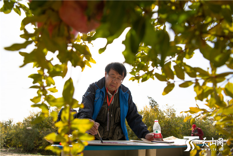 新疆头条讯(记者张迎春 董潇涵报道)一个个红似小灯笼的石榴挂满枝头,晶莹剔透的石榴籽果汁饱满,鲜香四溢。10月18日,全国知名画家慕名而来,望着满园红彤彤的石榴,喜不自禁,果园铺桌,石榴为景、农民做模,现场泼墨作画,与农民一起分享丰收的喜悦。