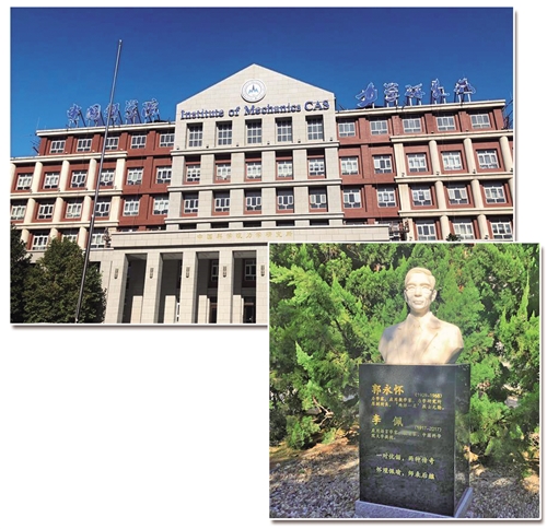 上图 中科院力学研究所主楼。郭静原摄右图 中科院力学研究所内,郭永怀与李佩先生合葬的墓碑。 郭静原摄