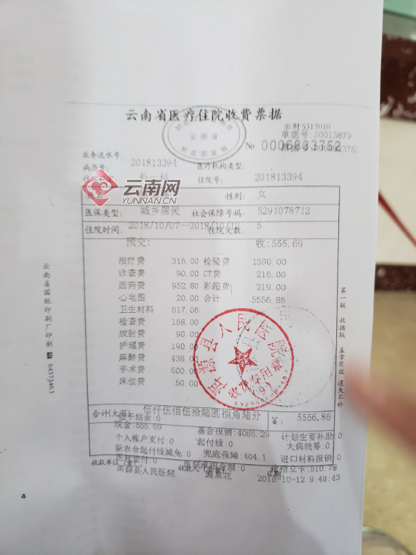 来自茈碧湖镇碧云村15岁的赵闺燕才做完阑尾炎手术。“我是来做阑尾炎手术的,手术和住院费用一共是5556元,报销后只用交555元。”她说道。“而且只用在这里缴一次费,不用再跑其他地方。很方便了。”