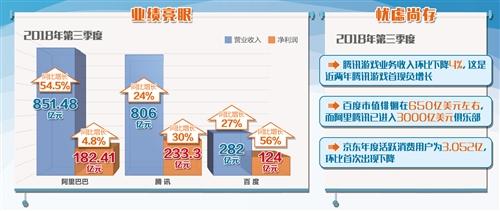 BAT(百度、阿里巴巴、腾讯)传统互联网三巨头的表现仍是市场关注的焦点。仅从盈利能力看,这三家的表现依然亮眼。2018年第三季度,阿里巴巴营收达851.48亿元,同比增长54.5%,增速超过硅谷FAANG(脸书、亚马逊、苹果、奈飞、谷歌)五大公司。阿里净利润182.41亿元,同比增长4.8%;腾讯在第三次架构调整后首次发布财报,总营收突破800亿元达到806亿元,净利润233.3亿元,同比增长30%,超过市场预期;百度总营收为282亿元,净利润为124亿元,但增速在三家中最高,达56%。