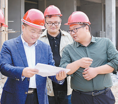 杨帆(左)带领班子成员走进项目施工现场,了解项目进度。新华社发