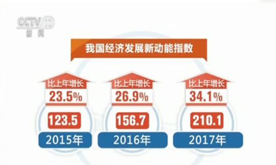 测算结果显示,2015到2017年我国经济发展新动能指数分别为123.5、156.7、210.1,分别比上年增长23.5%、26.9%和34.1%。