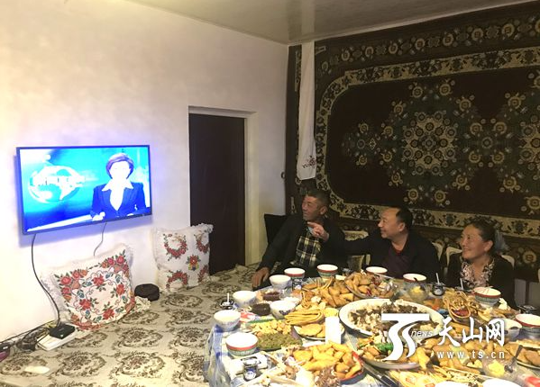 11月23日,陈树明(左二)在亲戚阿达力太家一起看电视。