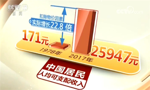 (民生)——1978年到2017年,中国居民人均可支配收入从171元增长到25947元,扣除物价因素,实际增长22.8倍。40年间,贫困人口减少7.4亿,减贫人口占同期全球减贫总数70%以上。