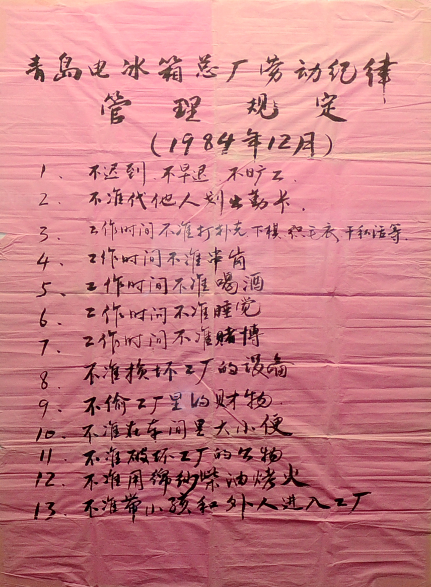 到任伊始,为了整顿生产秩序,我们制定了13条规章制度——《青岛电冰箱总厂劳动纪律管理规定》,贴在工厂四周的墙壁上。其中第10条规定是“不准在车间里大小便”。今天,很多人看到这些规定都会觉得好笑、不可思议。但当时,恰恰是这些规定,让厂里环境发生了翻天覆地的变化。