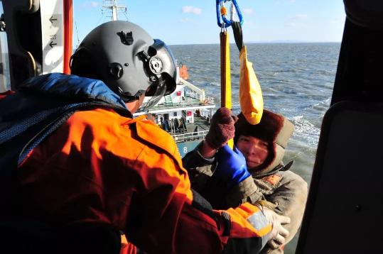 2018年12月26日0452时,北海救助局接辽宁海上搜救中心信息:在北海3号位以东约60海里处,运砂船“海虹01”轮(船长120米,载10000吨海沙)进水沉没,船上12人,已逃至救生筏待救,请求救助。接报后,北海第一救助飞行队“B-7312”救助直升机立即前往事发海域,在大风浪中先后救起全部12名落水船员。