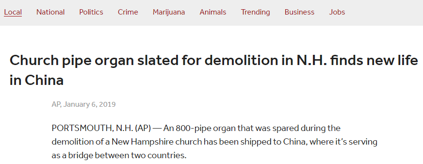 据美联社1月6日报道,在美国新罕布什尔州朴茨茅斯市,有着60年历史的圣詹姆斯教堂在去年5月被拆除。在此之前,教堂将管风琴挂在网上出售,希望能为这架管风琴寻觅一个新家。