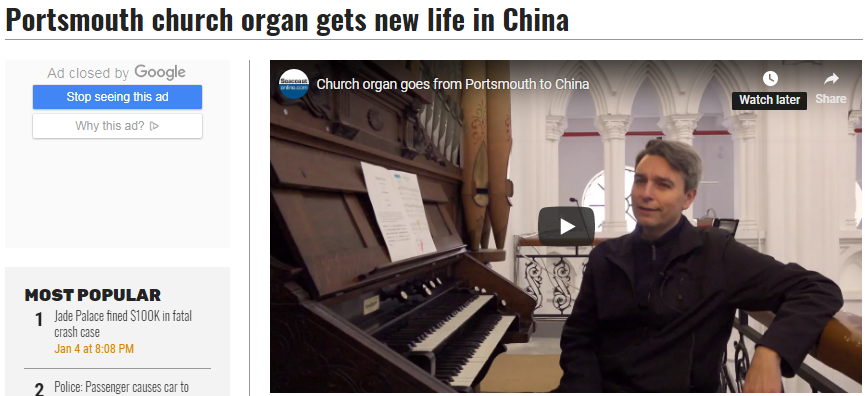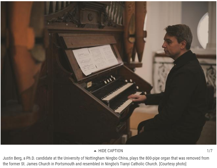 美国seacoastonline新闻网站报道称 2017年12月,伯格在网上看到了一则管风琴出售的广告,后来对方将这架管风琴免费送给了宁波。“唯一的条件是要在三周内将琴从教堂拆走。伯格需要赶快寻找一位经验丰富的管风琴建造师,尽快完成拆卸,并将琴从美国运走。”