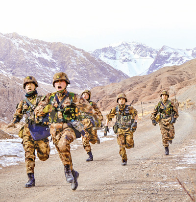 陆军某边防团斯姆哈纳边防连组织全员全装紧急出动和专业课目考核评比。图为官兵进行武装八公里越野考核。 杜麒麟摄