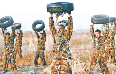 陆军第71集团军“临汾旅”组织实战化课目比武观摩。图为官兵在接近零摄氏度的环境中进行意志训练。张海辉摄