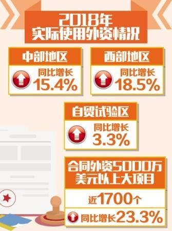 中西部地区实现快速增长。2018年,中部地区实际使用外资同比增长15.4%,西部地区同比增长18.5%。自贸试验区同比增长3.3%,占比为12.1%。