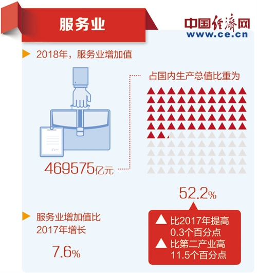 服务业对经济增长的贡献持续提升。2018年,服务业增加值469575亿元,占国内生产总值比重为52.2%,比2017年提高0.3个百分点,比第二产业高11.5个百分点;服务业增加值比上年增长7.6%,比国内生产总值和第二产业增加值增速分别高出1.0个和1.8个百分点;服务业增长对国民经济增长的贡献率为59.7%,比2017年提高0.1个百分点,比第二产业高23.6个百分点;拉动全国GDP增长3.9个百分点,比第二产业高出1.5个百分点,继续发挥经济增长“稳定器”作用。