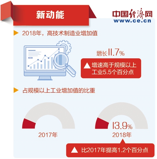 随着创新驱动发展战略的大力实施,新产业、新业态、新商业模式层出不穷,新技术、新产品、新服务不断涌现,新动能成为保持经济平稳增长的重要动力。2018年,规模以上工业战略性新兴产业增加值比2017年增长8.9%,规模以上工业高技术产业增加值比上年增长11.7%,分别高于整个规模以上工业2.7个和5.5个百分点。1月份至11月份,规模以上科技服务业企业营业收入同比增长15.0%,战略性新兴服务业企业营业收入同比增长14.9%,分别高于全部规模以上服务业企业营业收入增速3.5个和3.4个百分点。(作者:国家统计局国民经济核算司司长 赵同录)