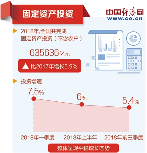 2018年,全国共完成固定资产投资(不含农户)635636亿元,比2017年增长5.9%。2018年一季度、上半年和前三季度投资增速分别为7.5%、6%和5.4%,整体呈现平稳增长态势。