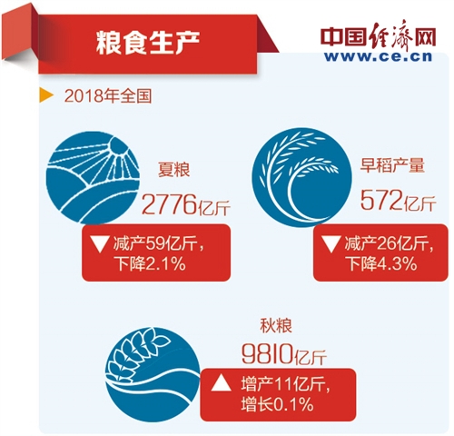 总体来看,2018年我国粮食生产基本稳定,全年粮食总产量虽因夏粮、早稻减产有所下降,但减幅不大,仍稳定在13000亿斤以上,处于历史较高水平。种植结构进一步优化。分季节看,夏粮、早稻减产,秋粮增产。2018年全国夏粮2776亿斤,减产59亿斤,下降2.1%;早稻产量572亿斤,减产26亿斤,下降4.3%;秋粮9810亿斤,增产11亿斤,增长0.1%。