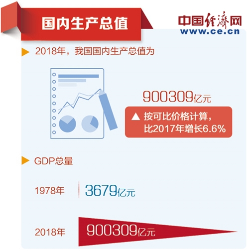 2018年,我国国内生产总值为900309亿元,按可比价格计算,比2017年增长6.6%。经过改革开放40年的发展,我国经济实力不断增强,人民生活水平极大提高。GDP总量从1978年的3679亿元飞升到2018年的900309亿元,稳居世界第二。