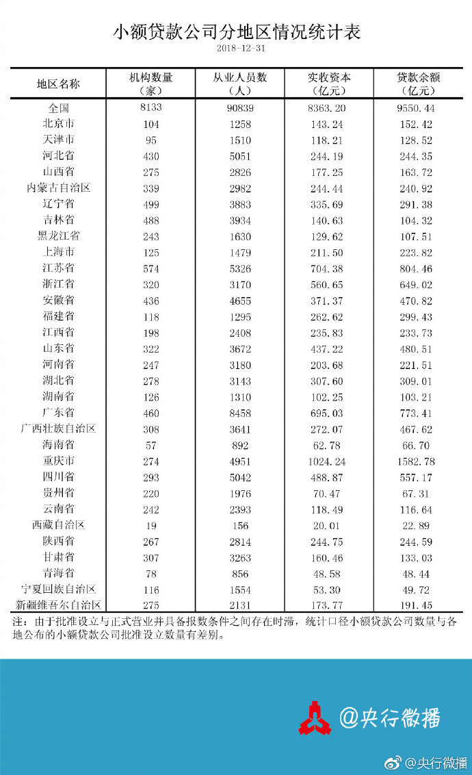央行:截至2018年末全国共有小额贷款公司8133家