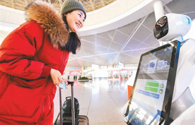 1月22日,在呼和浩特火车东站,机器人为乘客提供咨询服务。