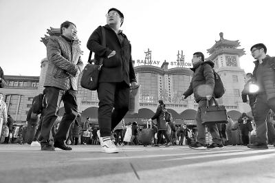 北京各火车站近日迎来春运客流高峰。图为北京站前广场上,乘客步履匆匆,准备回家过年。实习生 刘长鑫摄