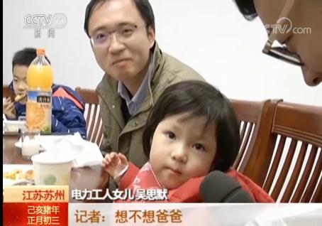 电力工人女儿 吴思默:(多长时间没有见到爸爸了?)好长时间。(想不想爸爸?)想。(什么时候最想爸爸?)起床的时候。