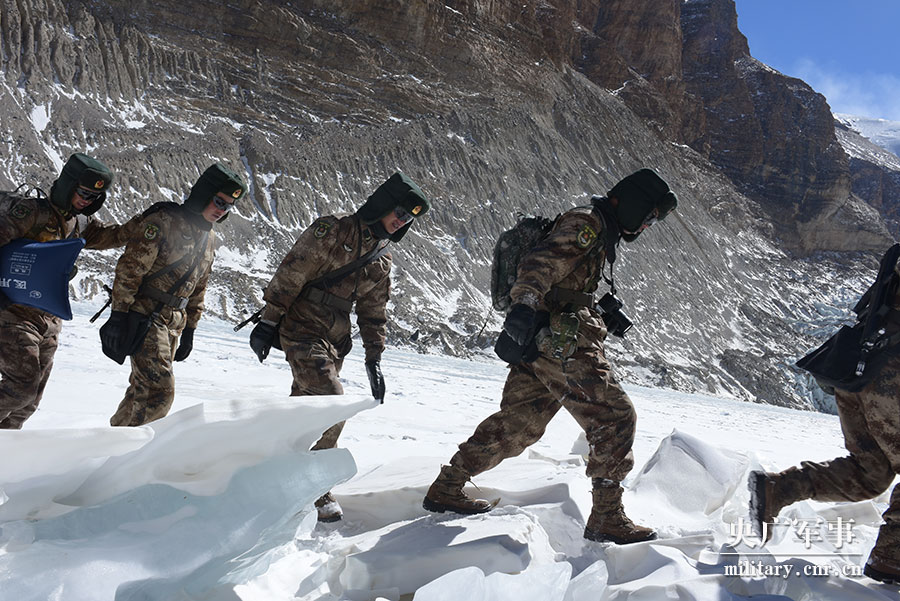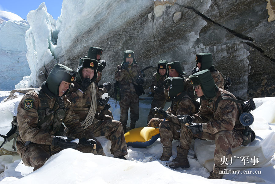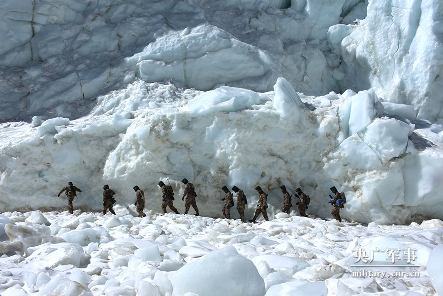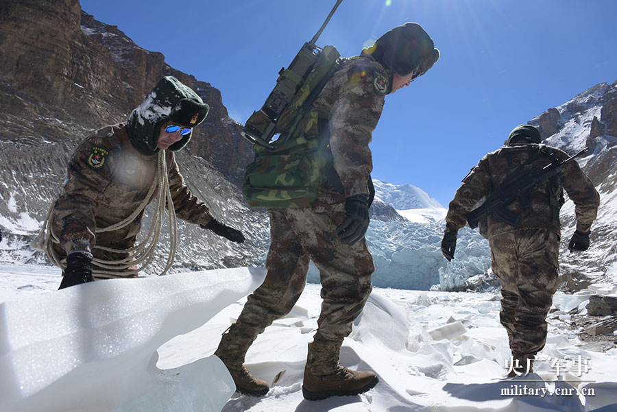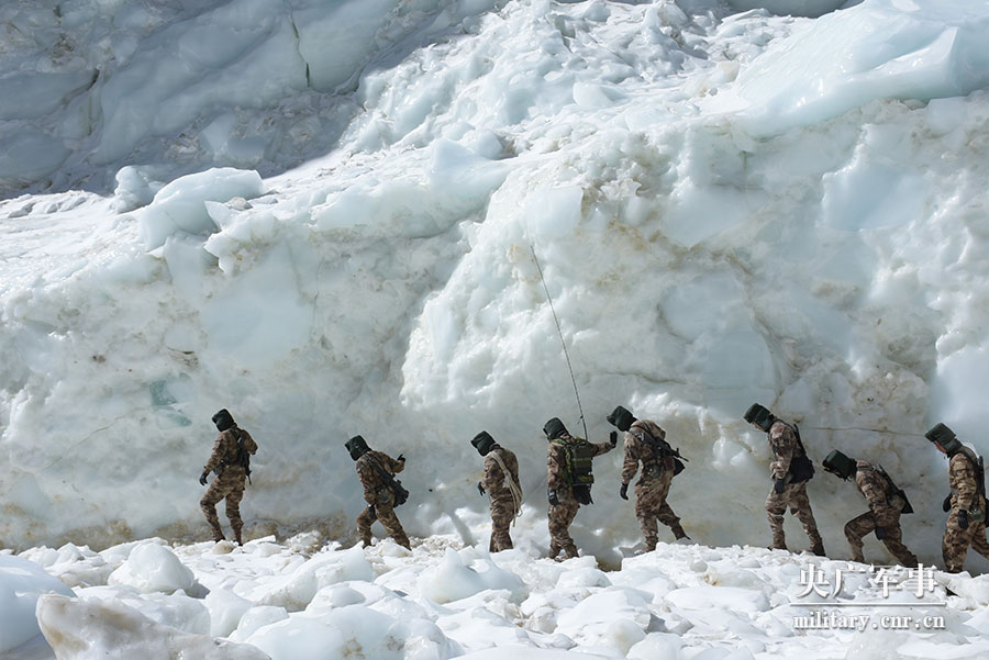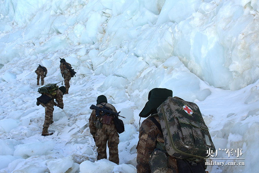 鸟不敢来,哨兵常在。张宇对这个冰川再熟悉不过了,数度与之交手。只见他简单勘察地形,迅速牵绳上前,招呼队员跟上。笔者排在垫后的下士卫生员崔元博前面,咬紧牙关跟上。