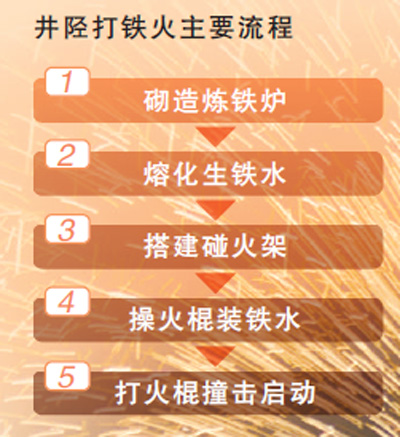 井陉县文化馆退休干部张树林介绍说,打铁火表演分为三个阶段。头道是“开门火”,寓意天人合一,迅速带动全场的氛围;二道是“许愿火”,祈寿求福;最后一道是为苍生而造的“平安火”。