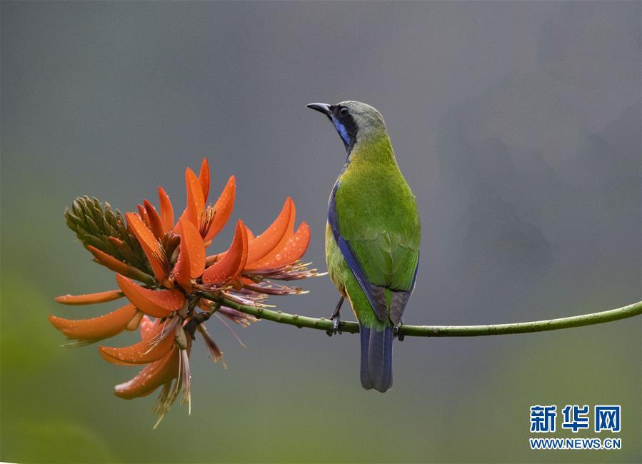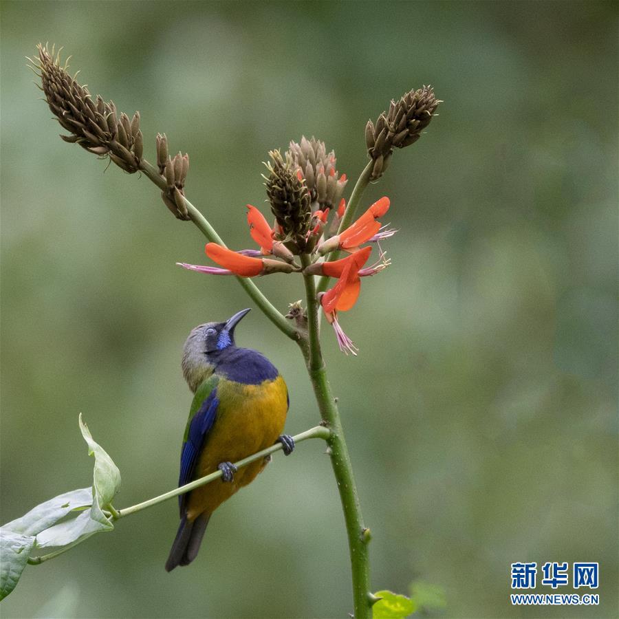 一只橙腹叶鹎在刺桐花枝头嬉戏(2月10日摄)。 初春时节,福建省福州市的樱花、刺桐花、羊蹄甲花渐次绽放,吸引小鸟前来嬉戏、采蜜。 新华社记者梅永存摄