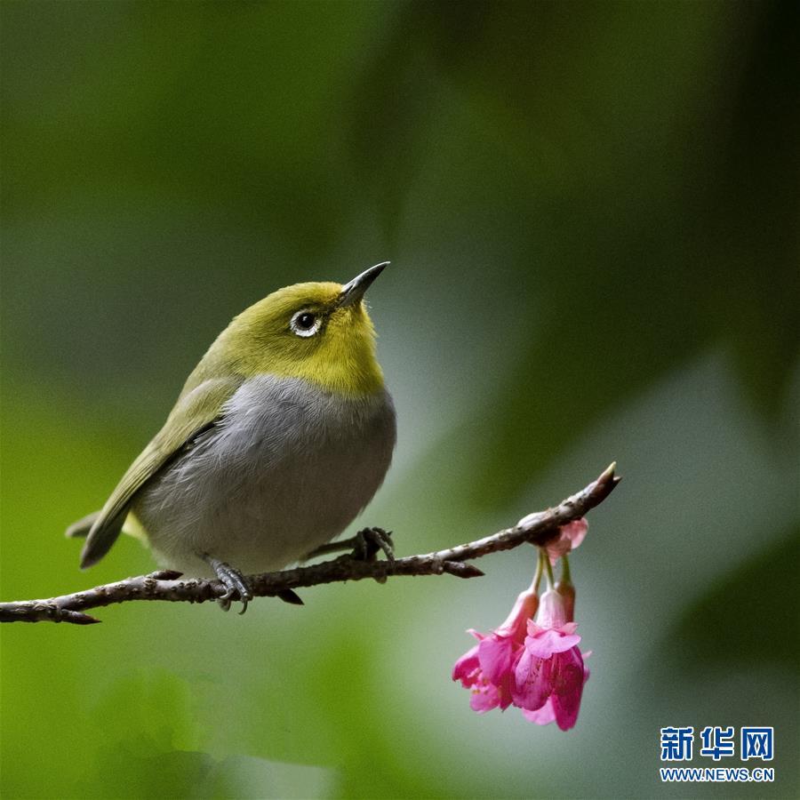 一只绣眼在樱花树枝上嬉戏(2月10日摄)。 初春时节,福建省福州市的樱花、刺桐花、羊蹄甲花渐次绽放,吸引小鸟前来嬉戏、采蜜。 新华社记者梅永存摄